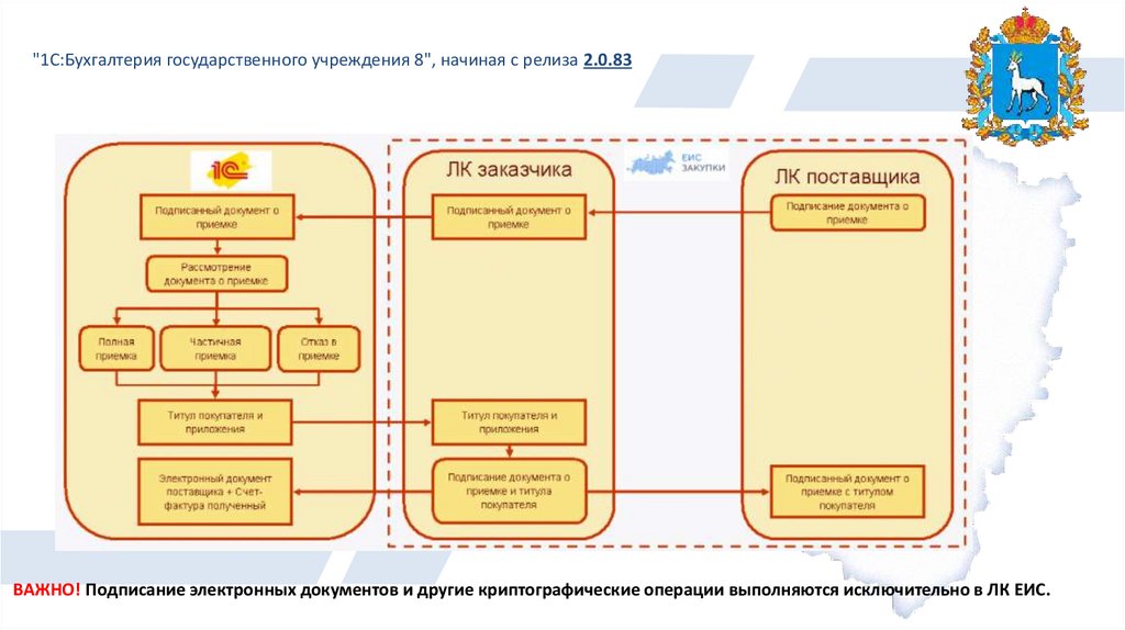 "1С:Бухгалтерия государственного учреждения 8", начиная с релиза 2.0.83ВАЖНО! Подписание электронных документов и другие криптографические операции выполняются исключительно в ЛК ЕИС.