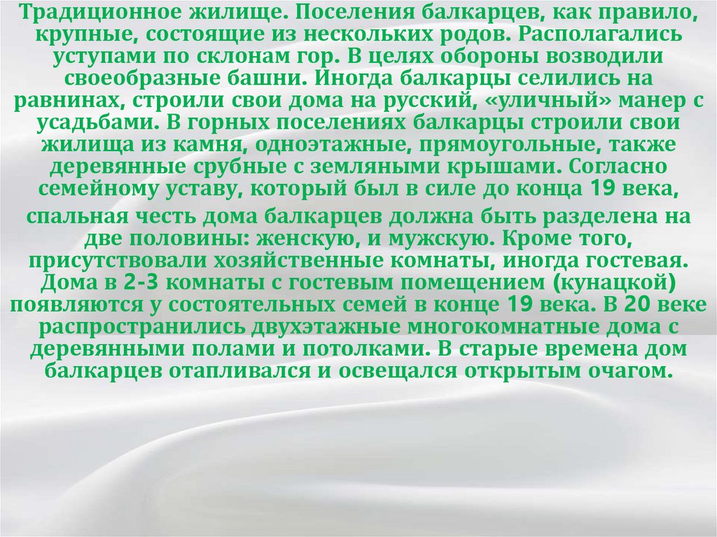 Традиционное жилище. Поселения балкарцев, как правило,крупные, состоящие из нескольких родов. Располагались