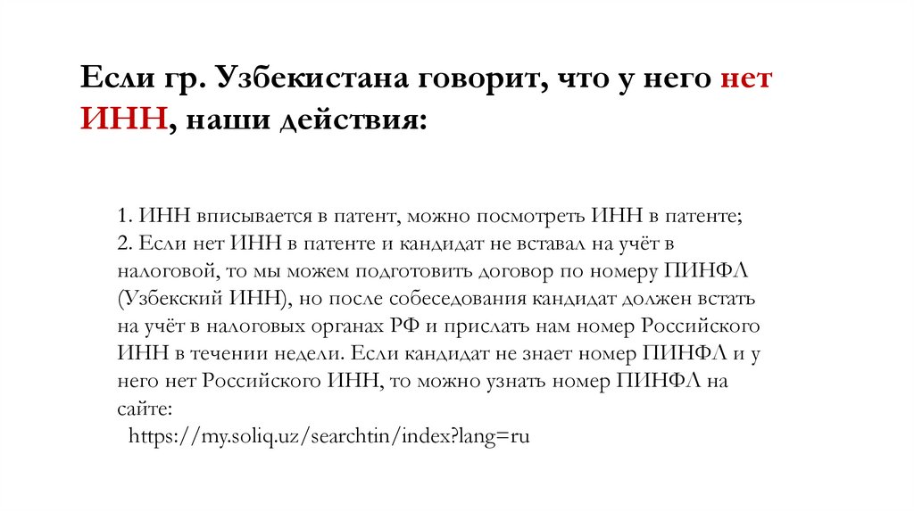 Если гр. Узбекистана говорит, что у него нетИНН, наши действия:
