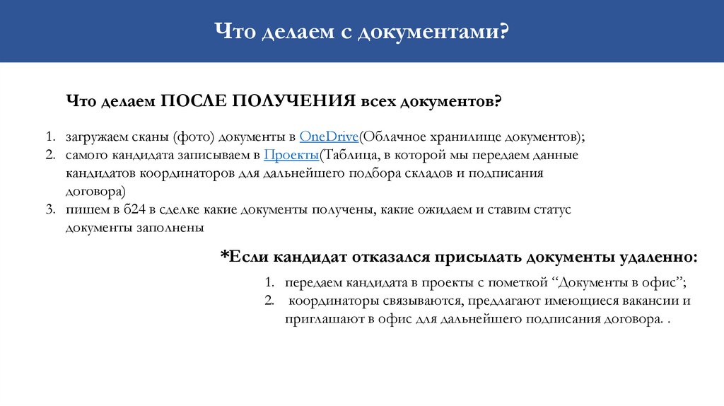 1. передаем кандидата в проекты с пометкой “Документы в офис”;