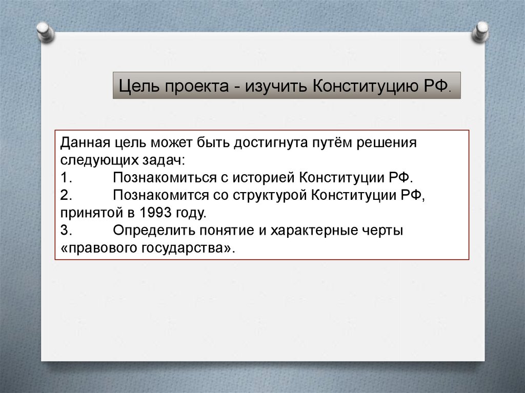 Цель проекта - изучить Конституцию РФ.Данная цель может быть достигнута путём решения