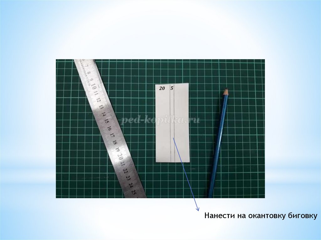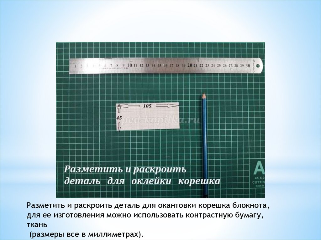 Разметить и раскроить деталь для окантовки корешка блокнота,для ее изготовления можно использовать контрастную бумагу,