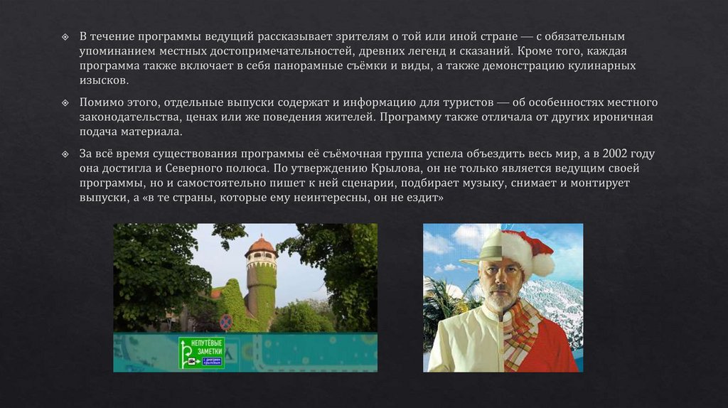 —телепрограмма о путешествиях, в которой её автор и
