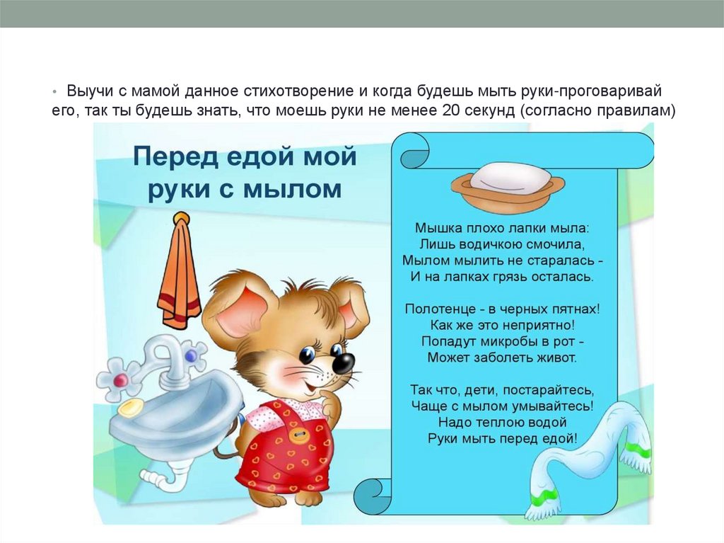 • Выучи с мамой данное стихотворение и когда будешь мыть руки-проговаривайего, так ты будешь знать, что моешь руки не менее 20 секунд (согласно правилам)
