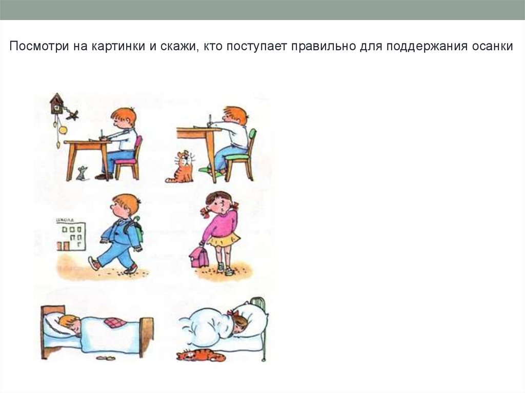 Посмотри на картинки и скажи, кто поступает правильно для поддержания осанки47.