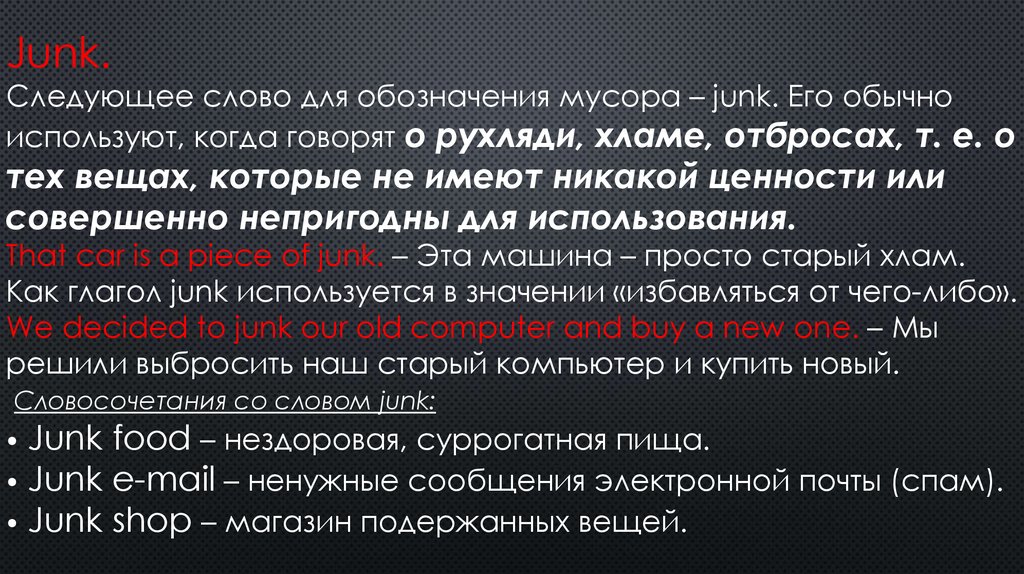 Junk.Следующее слово для обозначения мусора – junk. Его обычно