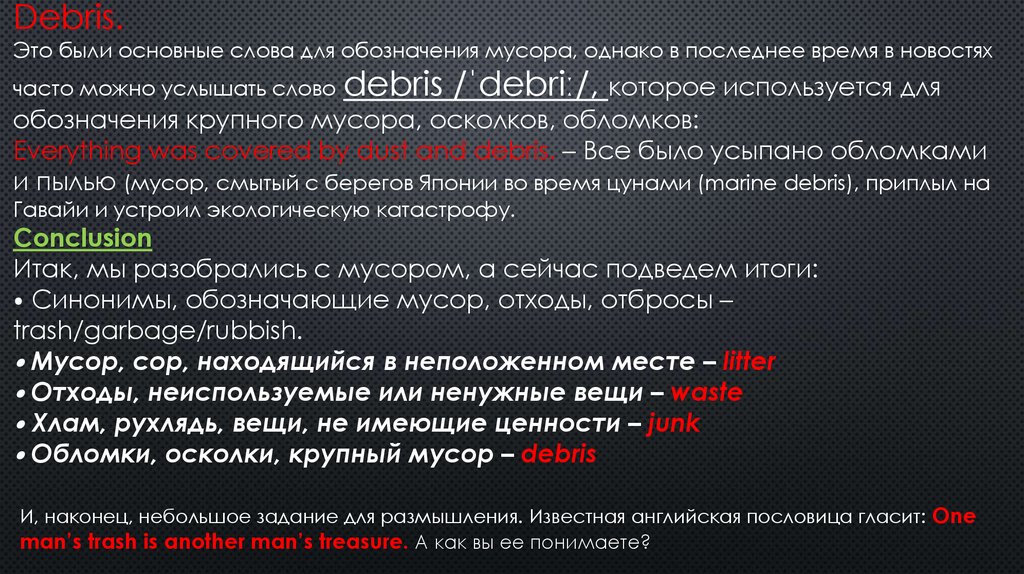 Debris.Это были основные слова для обозначения мусора, однако в последнее время в новостях
