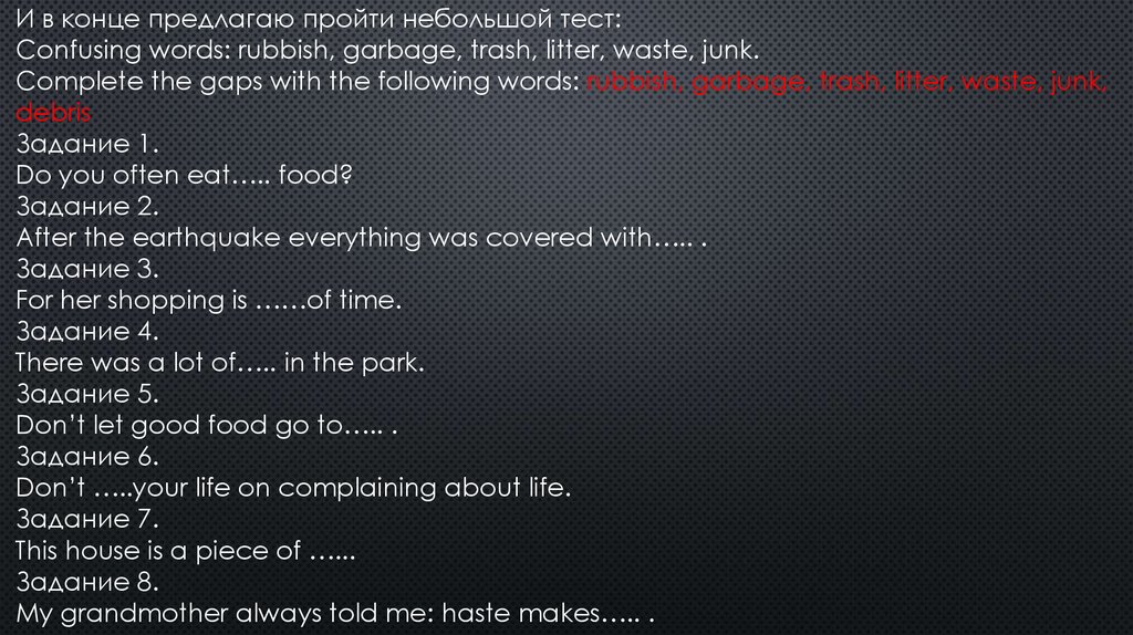 И в конце предлагаю пройти небольшой тест:Confusing words: rubbish, garbage, trash, litter, waste, junk.