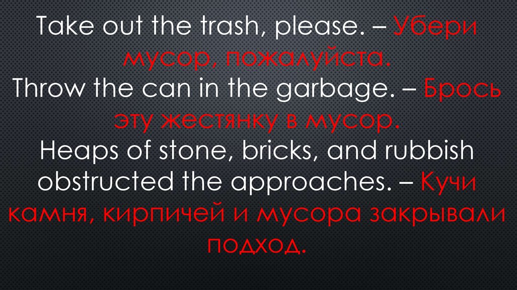 Take out the trash, please. – Уберимусор, пожалуйста.