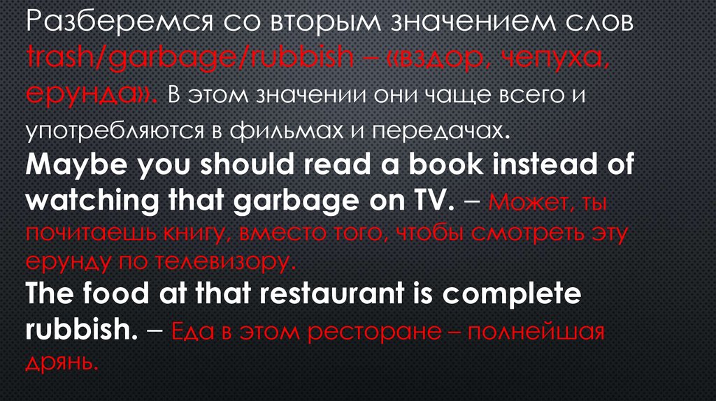 Разберемся со вторым значением словtrash/garbage/rubbish – «вздор, чепуха,