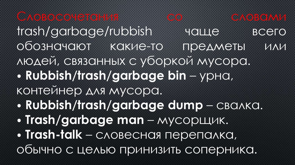 Garbage /‘ɡɑː(r)bɪdʒ/ обозначает «влажный» мусор, т. е. то, что