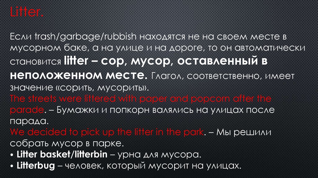 ⦁ Мусор, сор, находящийся в неположенном месте – litter