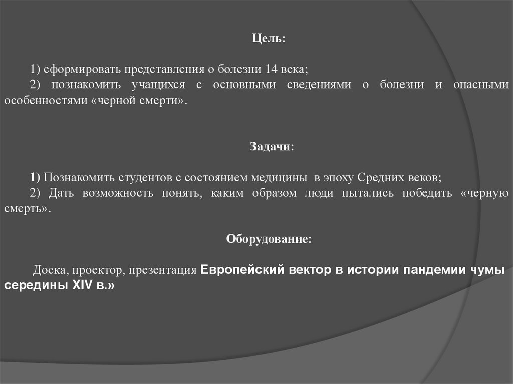 Цель:1) сформировать представления о болезни 14 века;