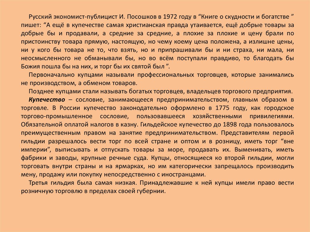 торговле. В России купечество законодательно оформлено в 1775 году, как городское