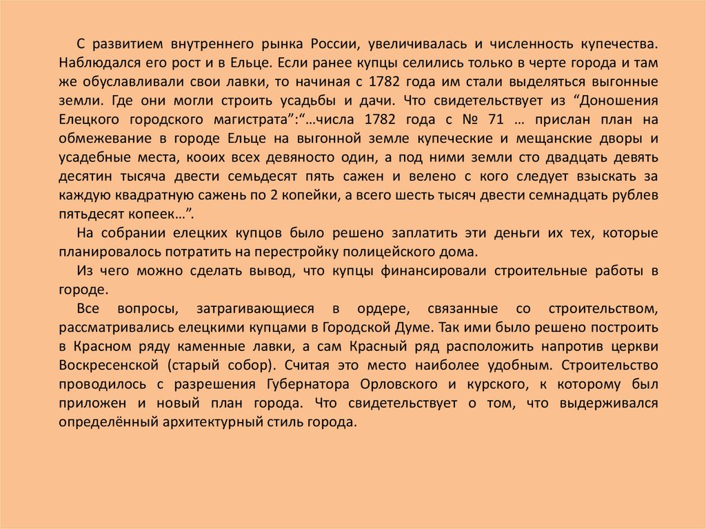 С развитием внутреннего рынка России, увеличивалась и численность купечества.Наблюдался его рост и в Ельце. Если ранее купцы селились только в черте города и там