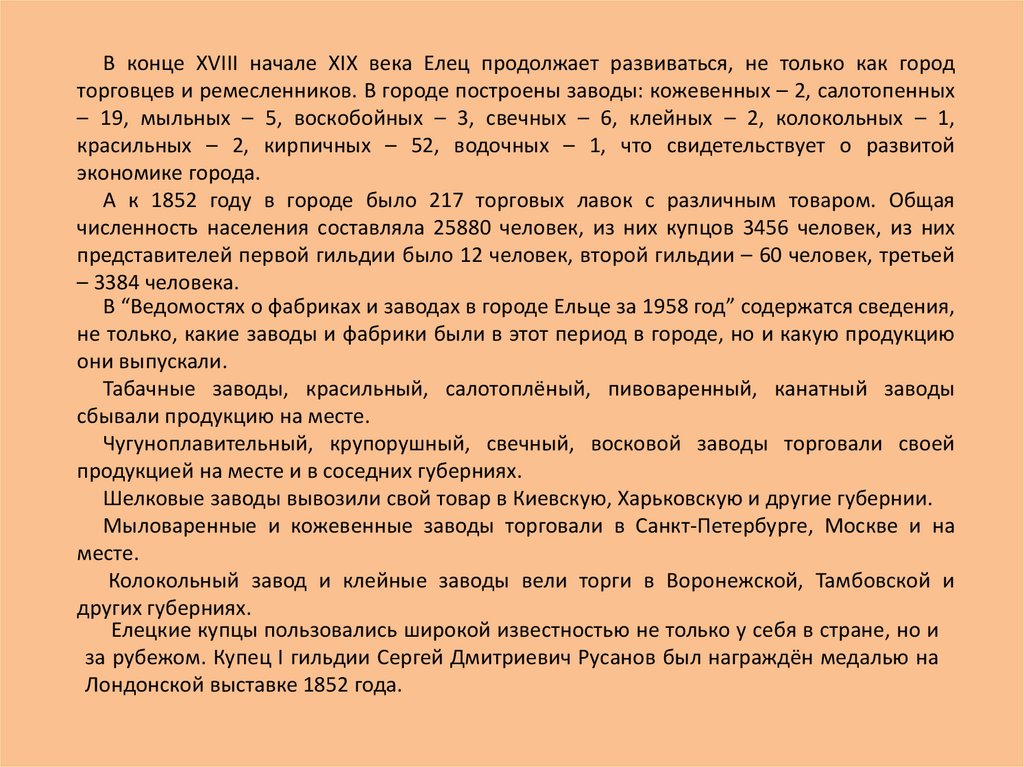 В конце XVIII начале XIX века Елец продолжает развиваться, не только как городторговцев и ремесленников. В городе построены заводы: кожевенных – 2, салотопенных