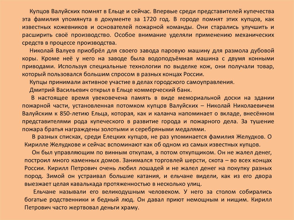 Купцов Валуйских помнят в Ельце и сейчас. Впервые среди представителей купечестваэта фамилия упомянута в документе за 1720 год. В городе помнят этих купцов, как