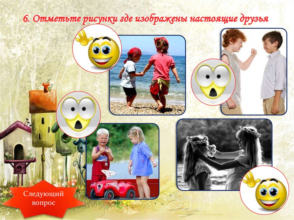 6. Отметьте рисунки где изображены настоящие друзьяСледующий