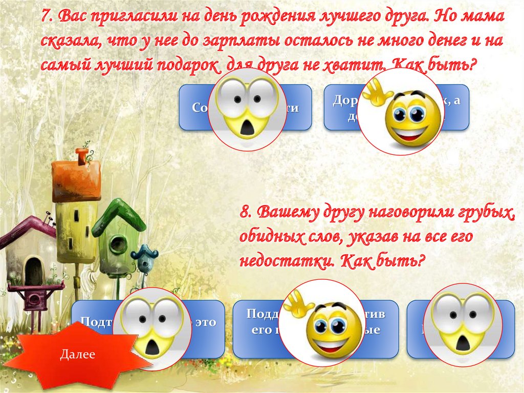 7. Вас пригласили на день рождения лучшего друга. Но мамасказала, что у нее до зарплаты осталось не много денег и на