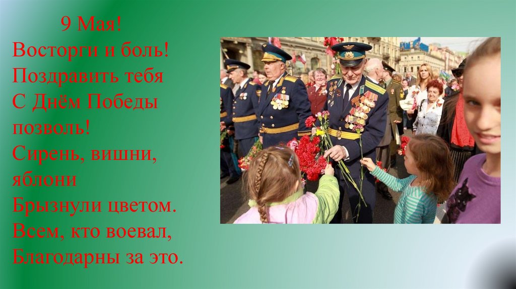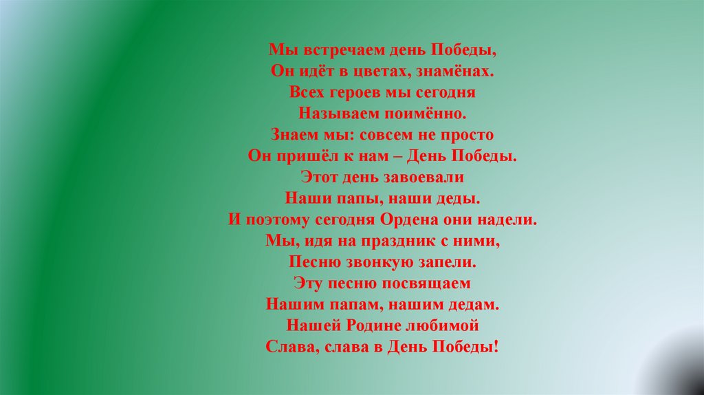 Мы встречаем день Победы,Он идёт в цветах, знамёнах.