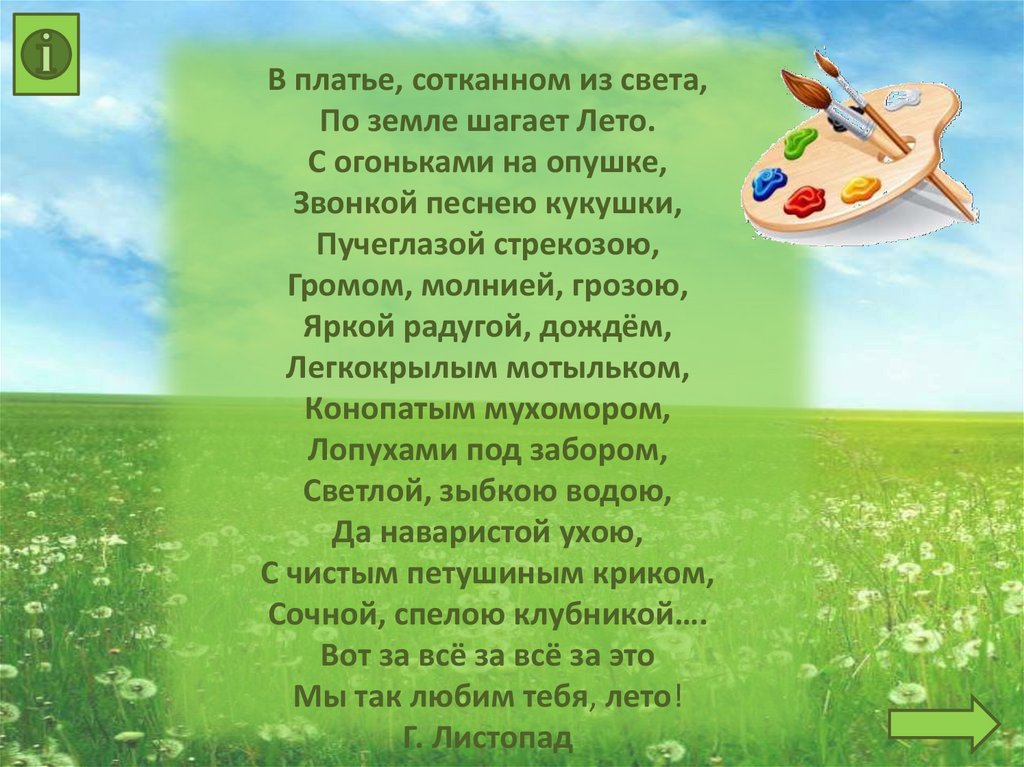В платье, сотканном из света,По земле шагает Лето.