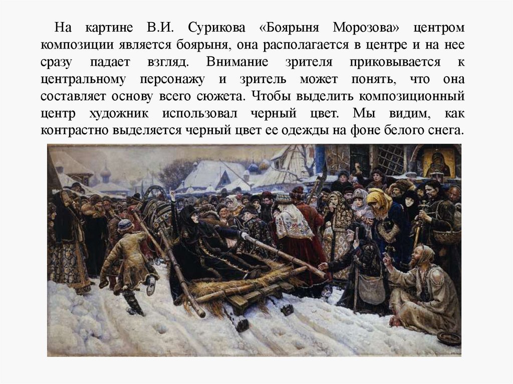 На картине В.И. Сурикова «Боярыня Морозова» центромкомпозиции является боярыня, она располагается в центре и на нее