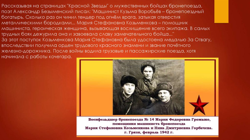 Рассказывая на страницах "Красной Звезды" о мужественных бойцах бронепоезда,поэт Александр Безыменский писал: "Машинист Кузьма Воробьёв – бронепоездный