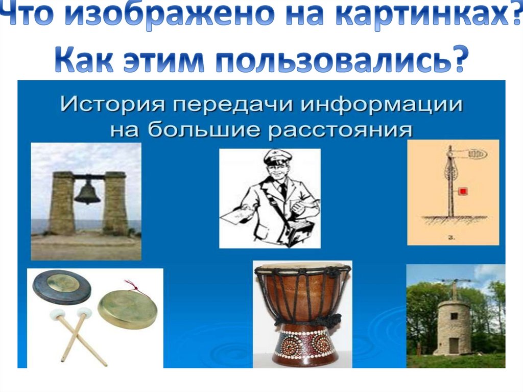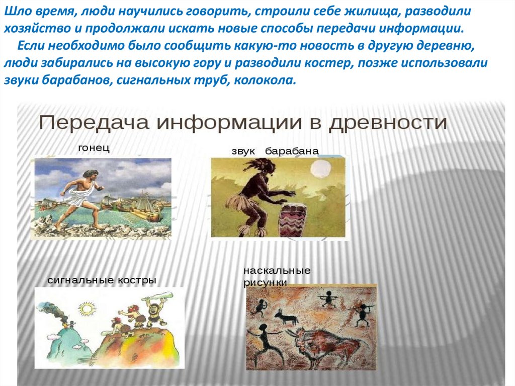 Шло время, люди научились говорить, строили себе жилища, разводилихозяйство и продолжали искать новые способы передачи информации.