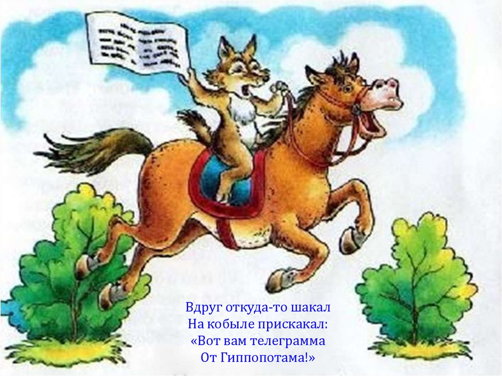 Вдруг откуда-то шакалНа кобыле прискакал: