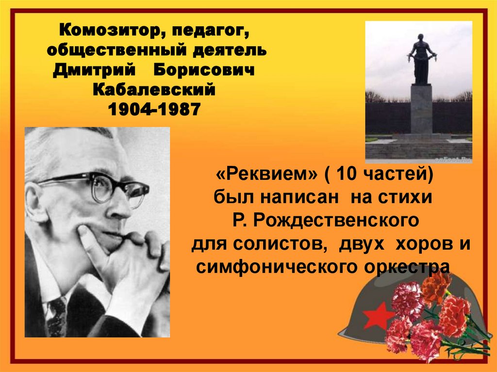 На слова поэмы Реквием написал музыку Д.Б.Кабалевский. Оставил книгу литературно-критических записок Разговор пойдет о песне.