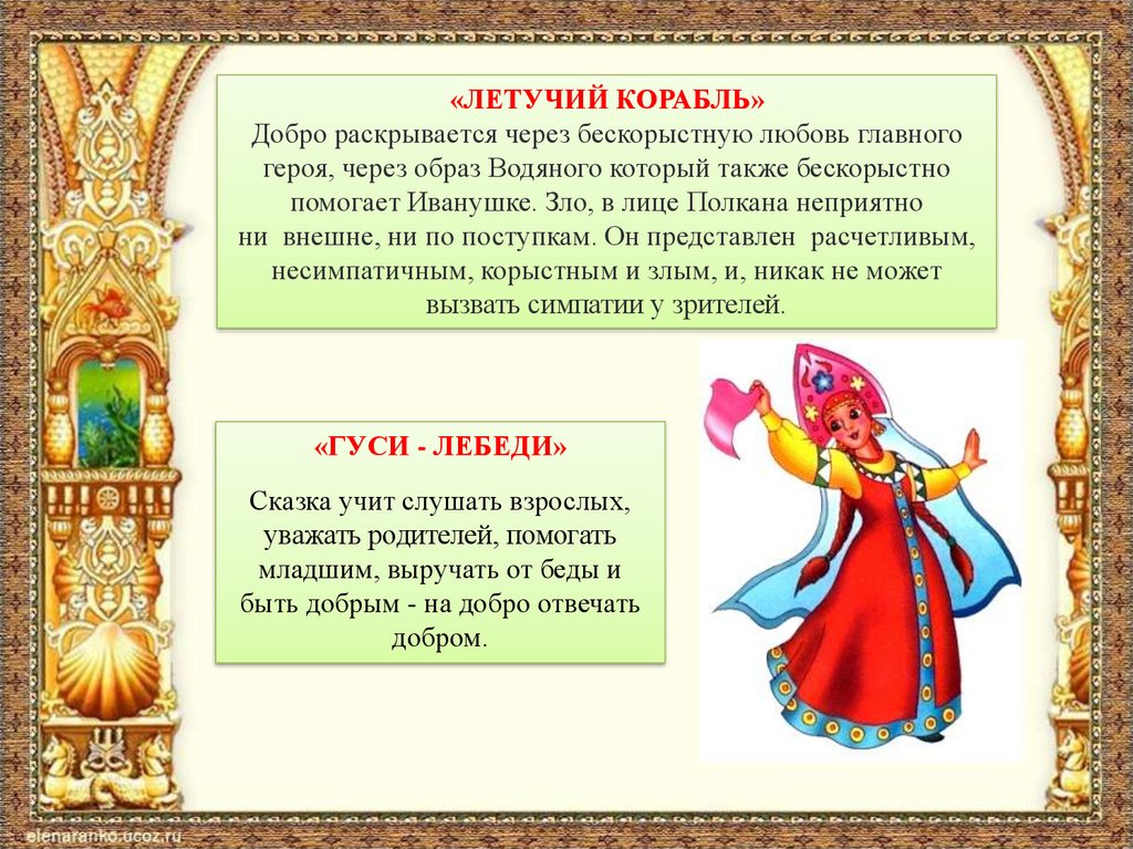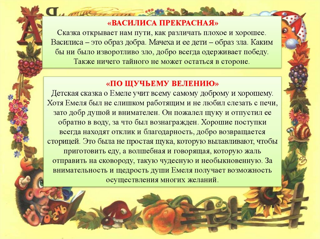 «ВАСИЛИСА ПРЕКРАСНАЯ»Сказка открывает нам пути, как различать плохое и хорошее.
