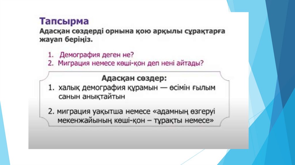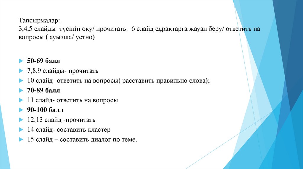 Тапсырмалар:3,4,5 слайды түсініп оқу/ прочитать. 6 слайд сұрақтарға жауап беру/ ответить на