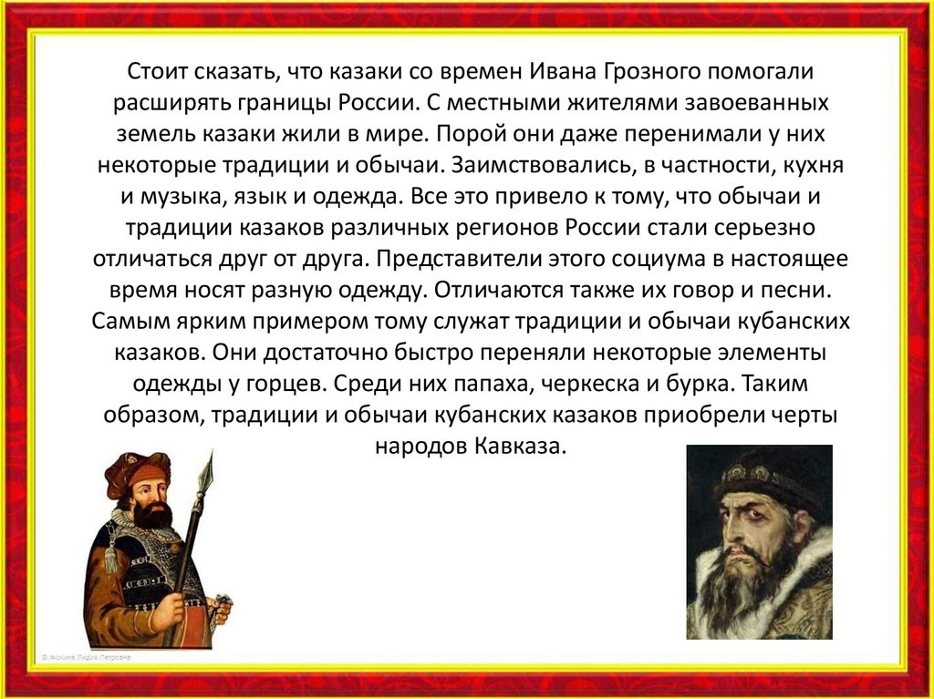 Стоит сказать, что казаки со времен Ивана Грозного помогалирасширять границы России. С местными жителями завоеванных