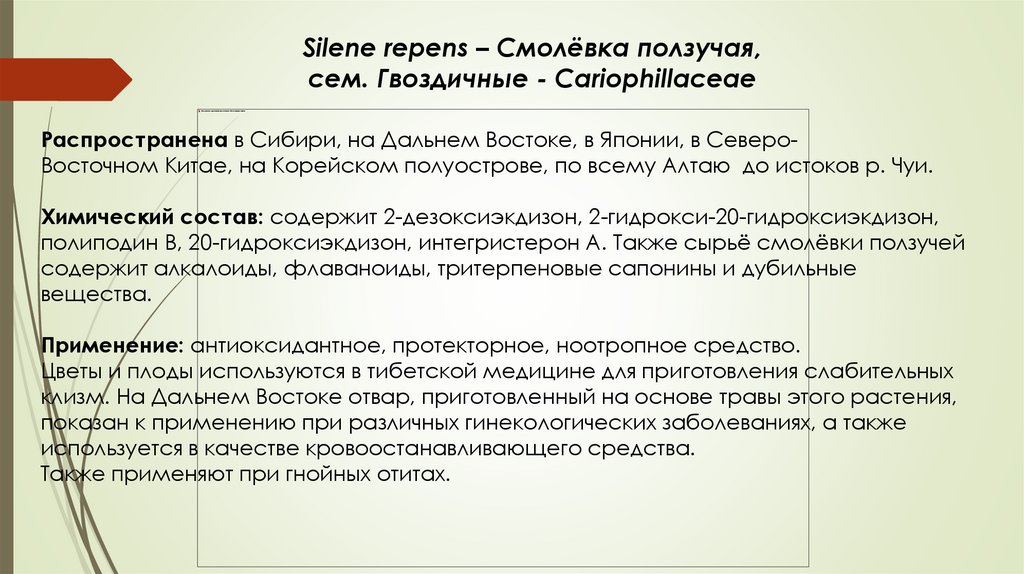 полиподин В, 20-гидроксиэкдизон, интегристерон А. Также сырьё смолёвки ползучей