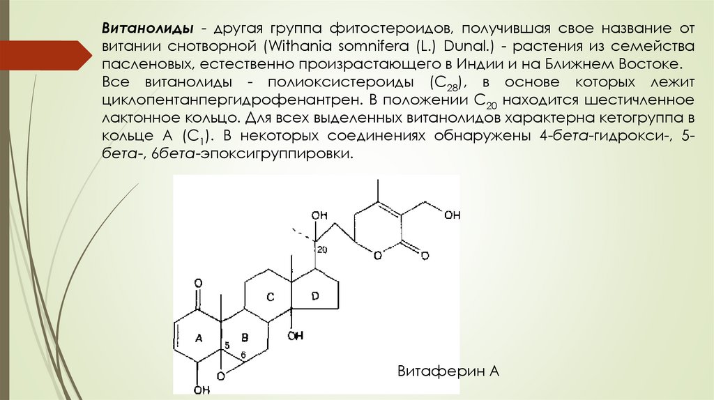 Витанолиды - другая группа фитостероидов, получившая свое название отвитании снотворной (Withania somnifera (L.) Dunal.) - растения из семейства