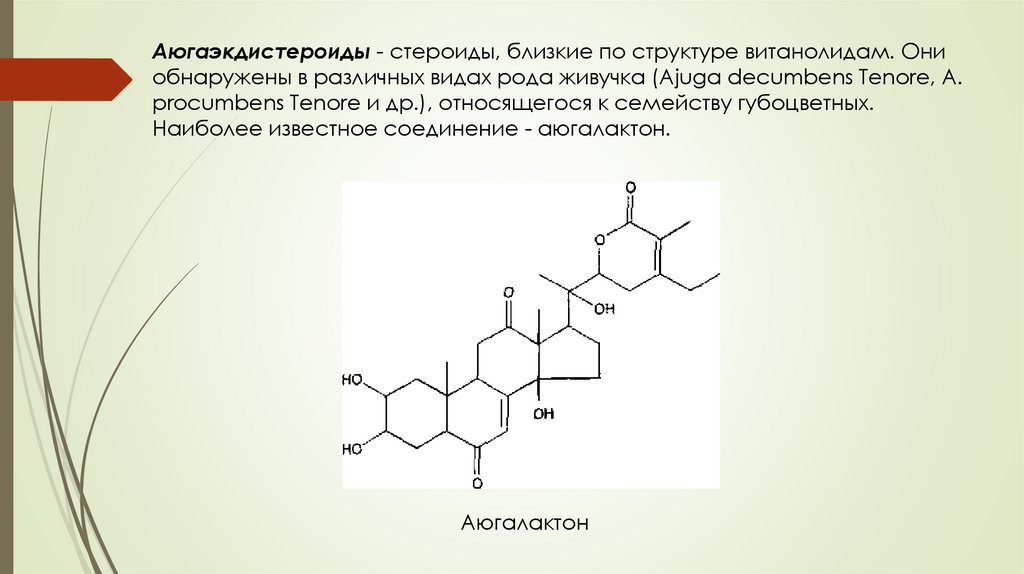Аюгаэкдистероиды - стероиды, близкие по структуре витанолидам. Ониобнаружены в различных видах рода живучка (Ajuga decumbens Tenore, A.