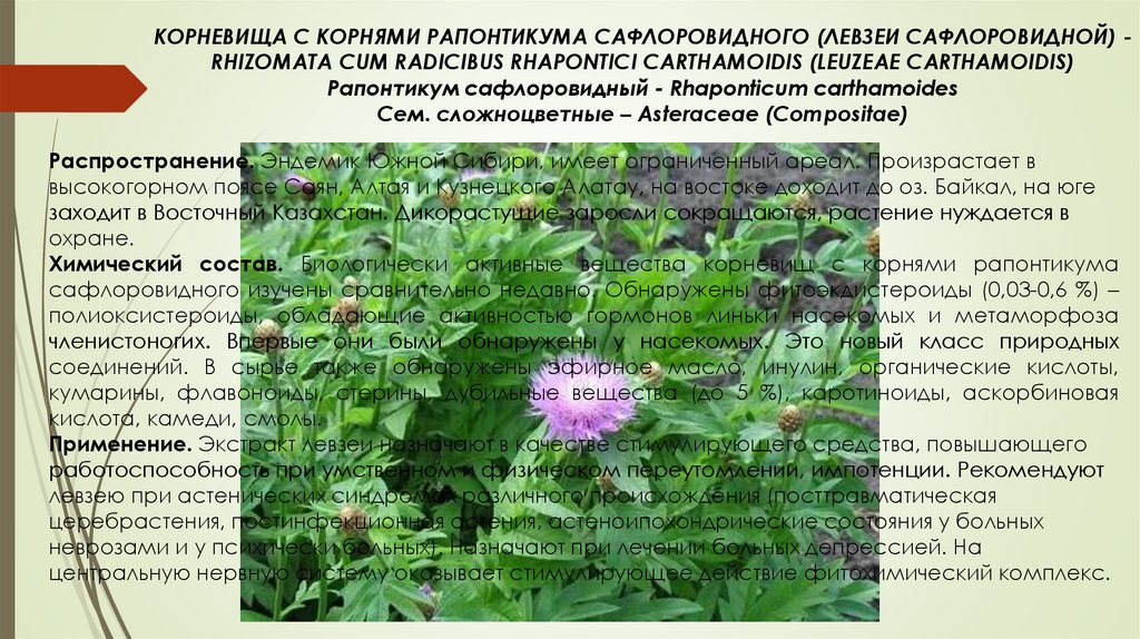 сафлоровидного изучены сравнительно недавно. Обнаружены фитоэкдистероиды (0,03-0,6 %) –