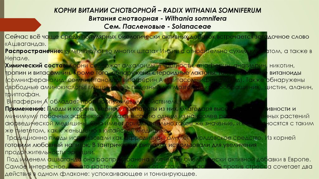 КОРНИ ВИТАНИИ СНОТВОРНОЙ – RADIX WITHANIA SOMNIFERUMВитания снотворная - Withania somnifera