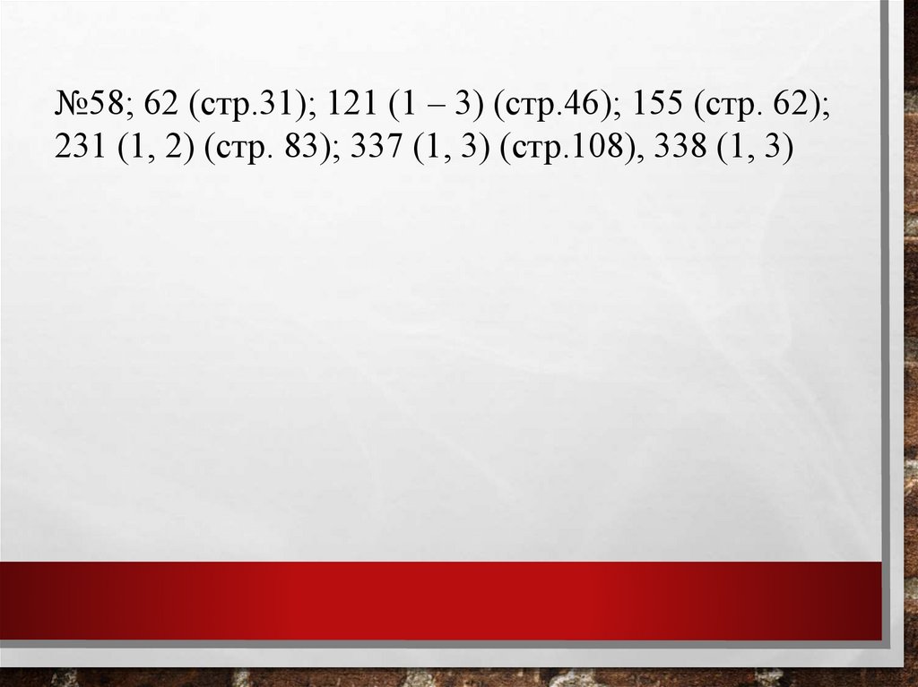 №58; 62 (стр.31); 121 (1 – 3) (стр.46); 155 (стр. 62);231 (1, 2) (стр. 83); 337 (1, 3) (стр.108), 338 (1, 3)