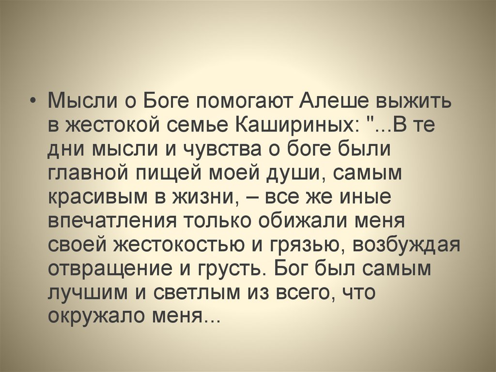 • Мысли о Боге помогают Алеше выжитьв жестокой семье Кашириных: "...В те
