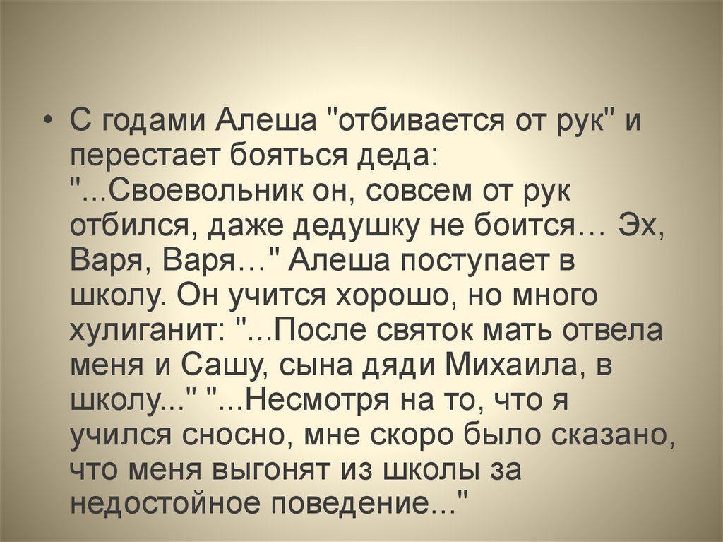 • С годами Алеша "отбивается от рук" иперестает бояться деда: