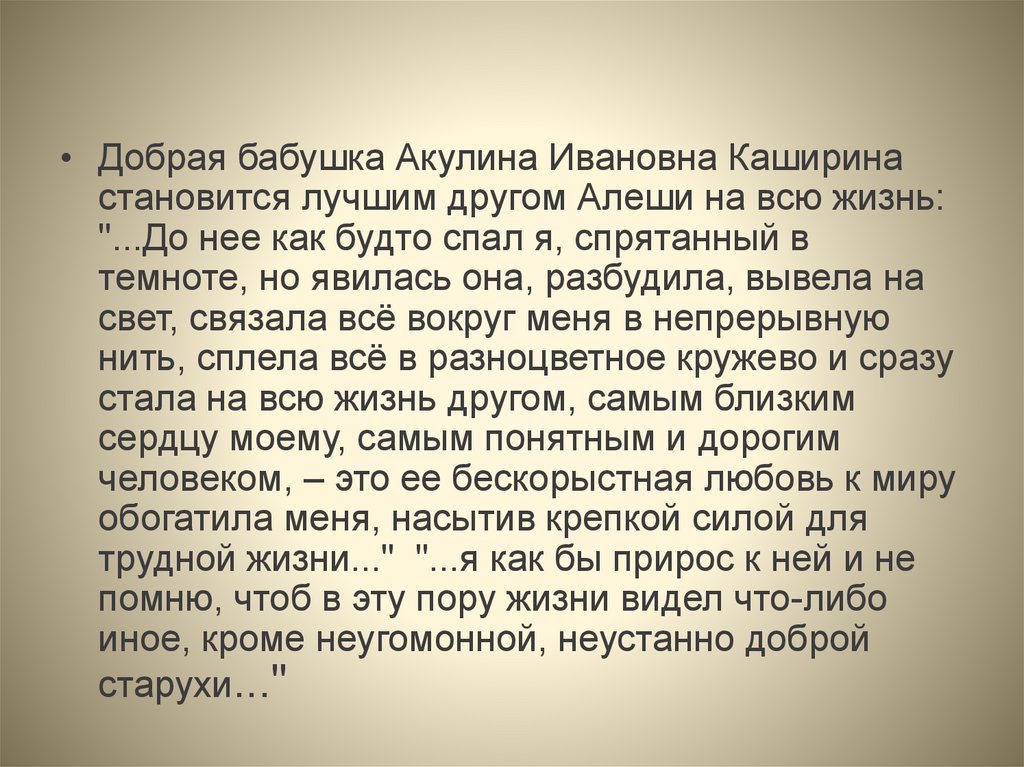 • Добрая бабушка Акулина Ивановна Каширинастановится лучшим другом Алеши на всю жизнь: