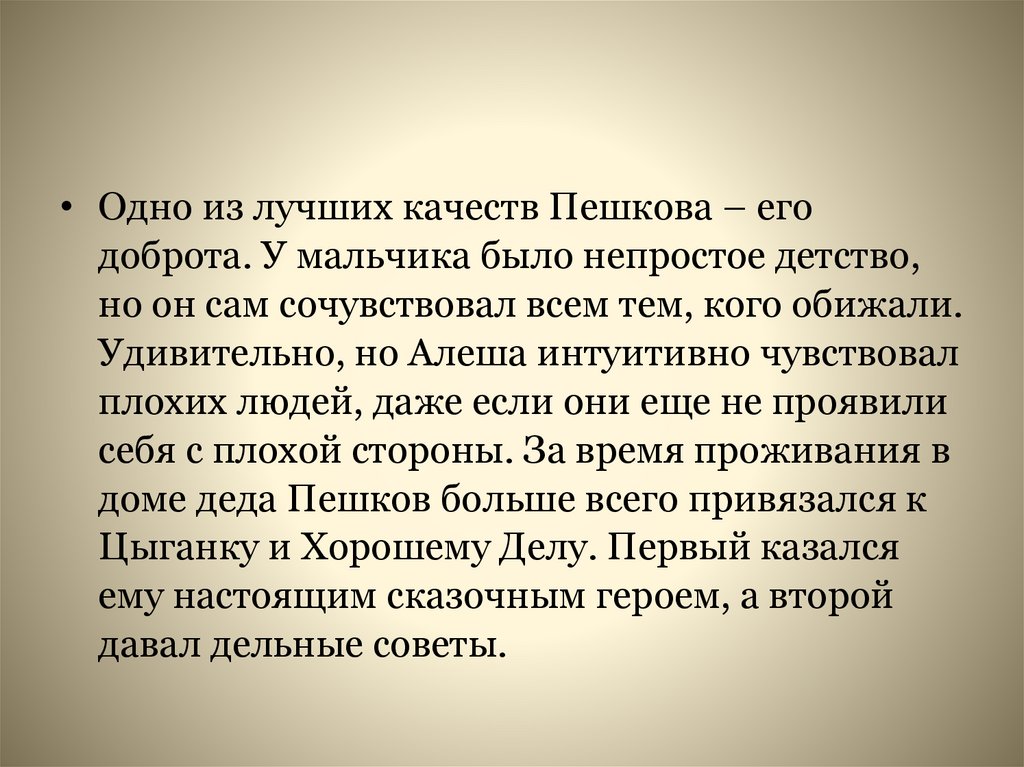 • Одно из лучших качеств Пешкова – егодоброта. У мальчика было непростое детство,