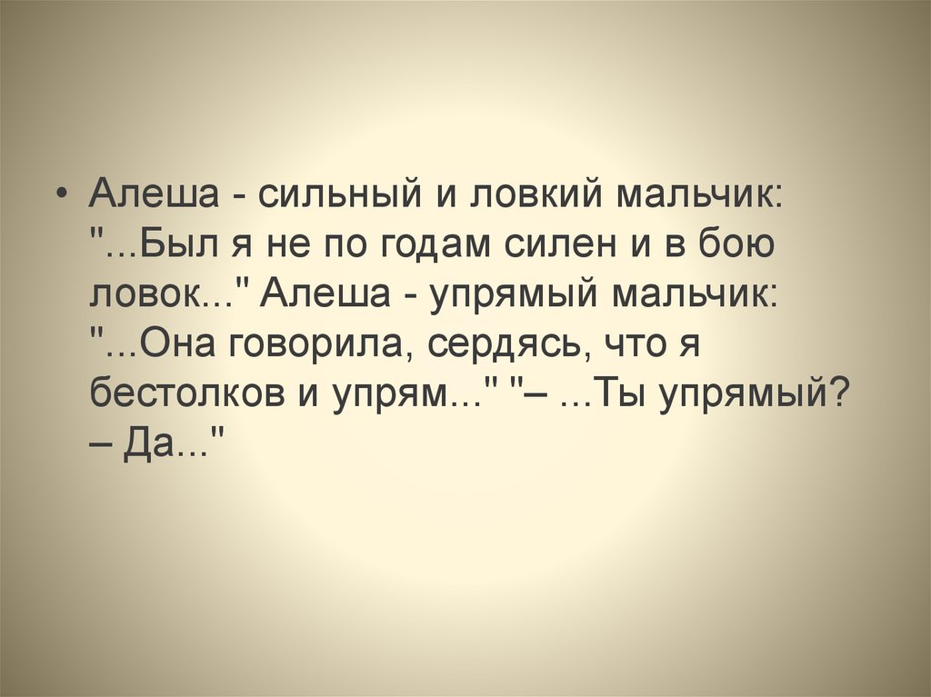 • Алеша - сильный и ловкий мальчик:"...Был я не по годам силен и в бою