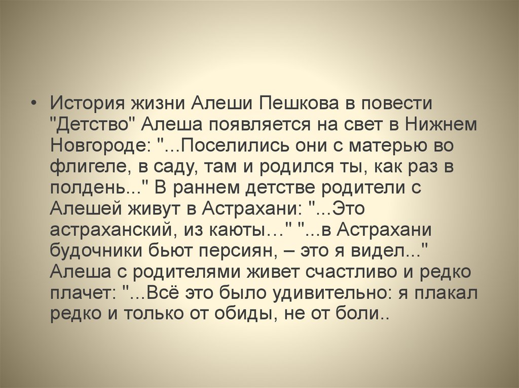 • История жизни Алеши Пешкова в повести"Детство" Алеша появляется на свет в Нижнем