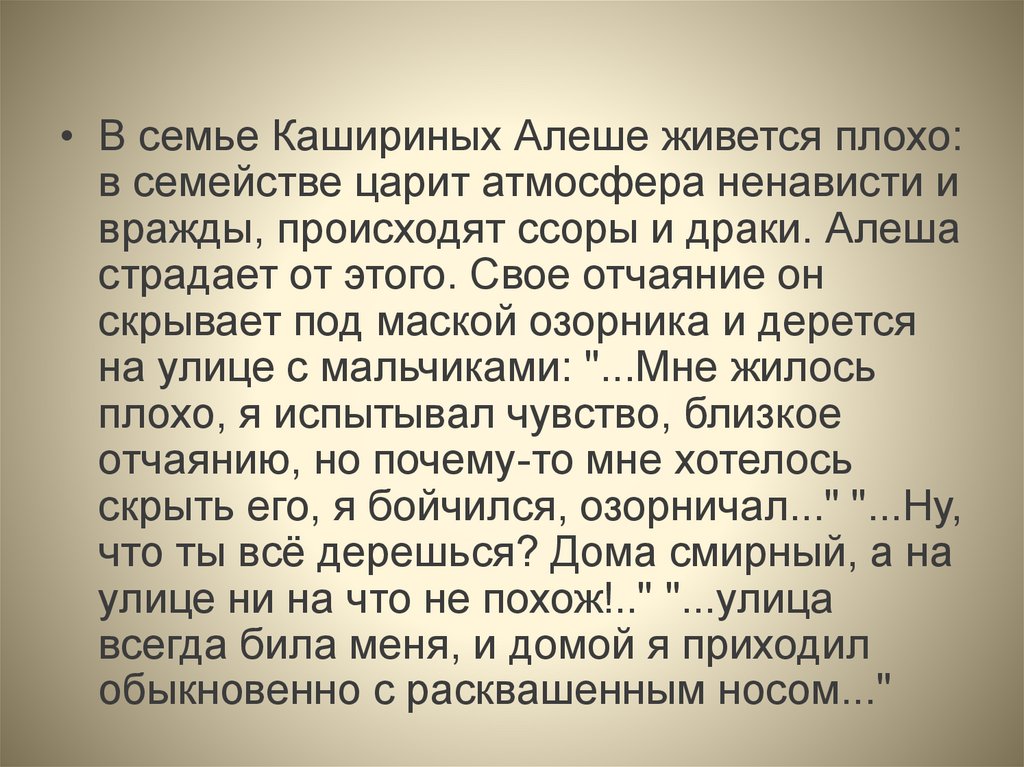 • В семье Кашириных Алеше живется плохо:в семействе царит атмосфера ненависти и