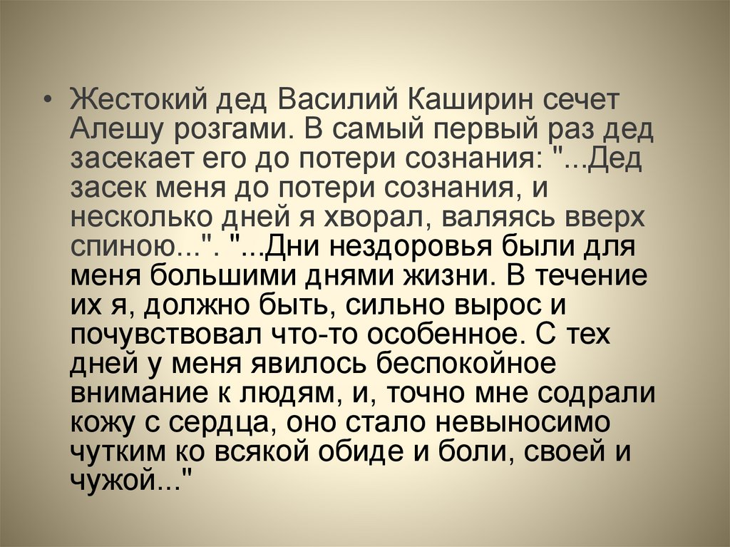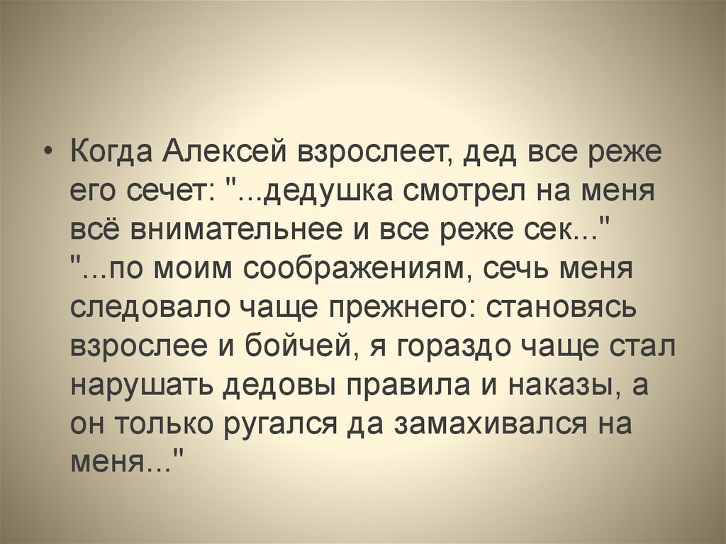 • Когда Алексей взрослеет, дед все режеего сечет: "...дедушка смотрел на меня
