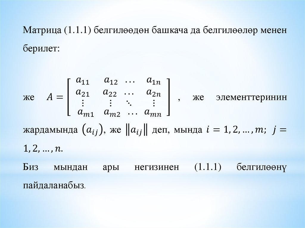 ыңгайлуу болот. Ошондуктан матрица түшүнүгүнѳ токтололу.