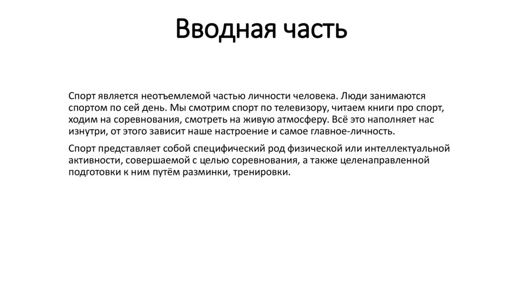 Вводная частьСпорт является неотъемлемой частью личности человека. Люди занимаются