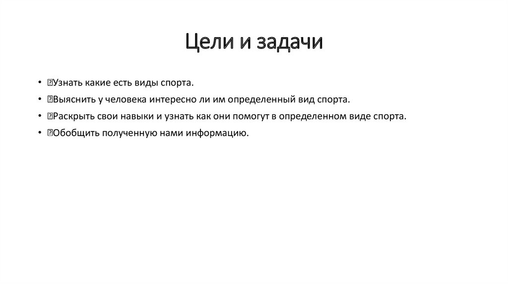 Цели и задачиУзнать какие есть виды спорта.